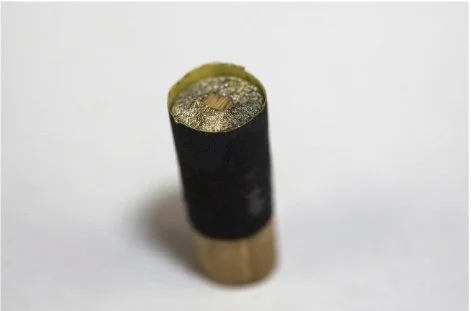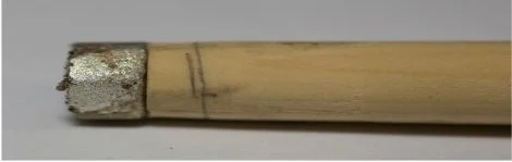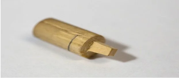 Step 5. Insert the bushing into the peg hole to pencil mark the cuts inside and outside the wall of the pegbox. Using a bandsaw cut at the marks on the wood and then the solder. If the soldered piece falls off during the cutting, it can be fastened with super glue.